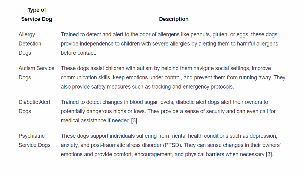 Service dogs are highly trained animals that perform specific tasks to assist individuals with disabilities. These disabilities can be physical, sensory, psychiatric, intellectual, or mental in nature. Service dogs are granted full public access rights, allowing them to accompany their owners to places where other animals are not typically allowed, such as restaurants, libraries, and public transportation [3].