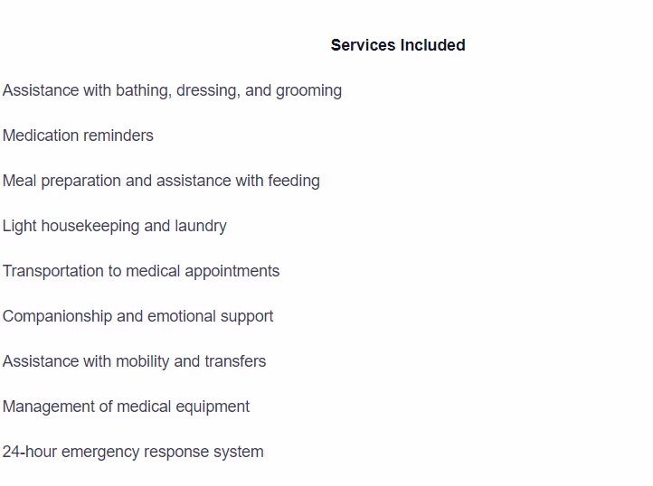 - Personal Care: Assistance with activities of daily living (ADLs) such as bathing, dressing, eating, toileting, and mobility.