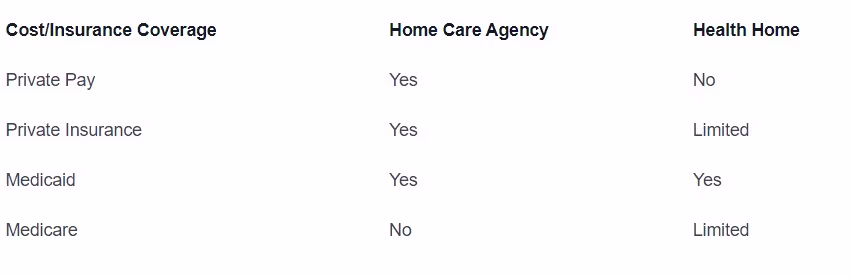 To assist in your evaluation, the following table provides a brief comparison of the key features of home care agencies and health homes: