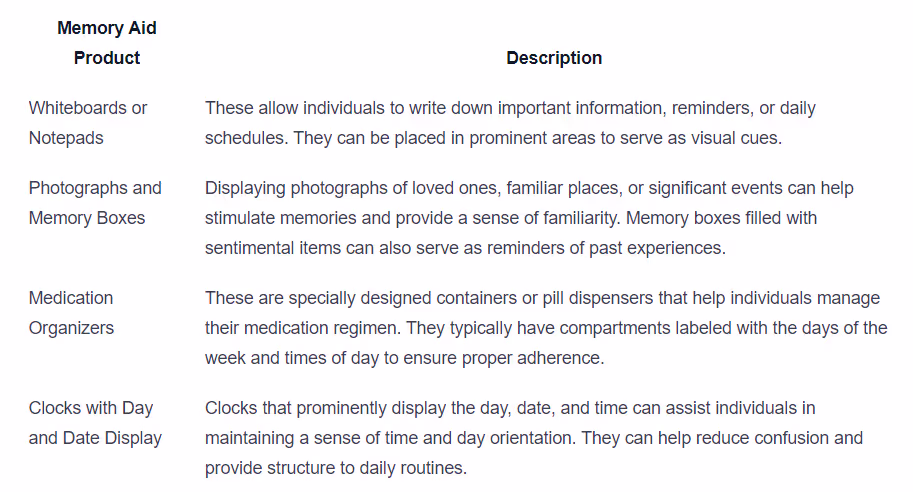 Memory aid products are designed to assist individuals with memory difficulties in their daily activities. They can provide prompts, reminders, and visual cues to help with task sequencing and memory recall. Here are some examples of memory aid products: